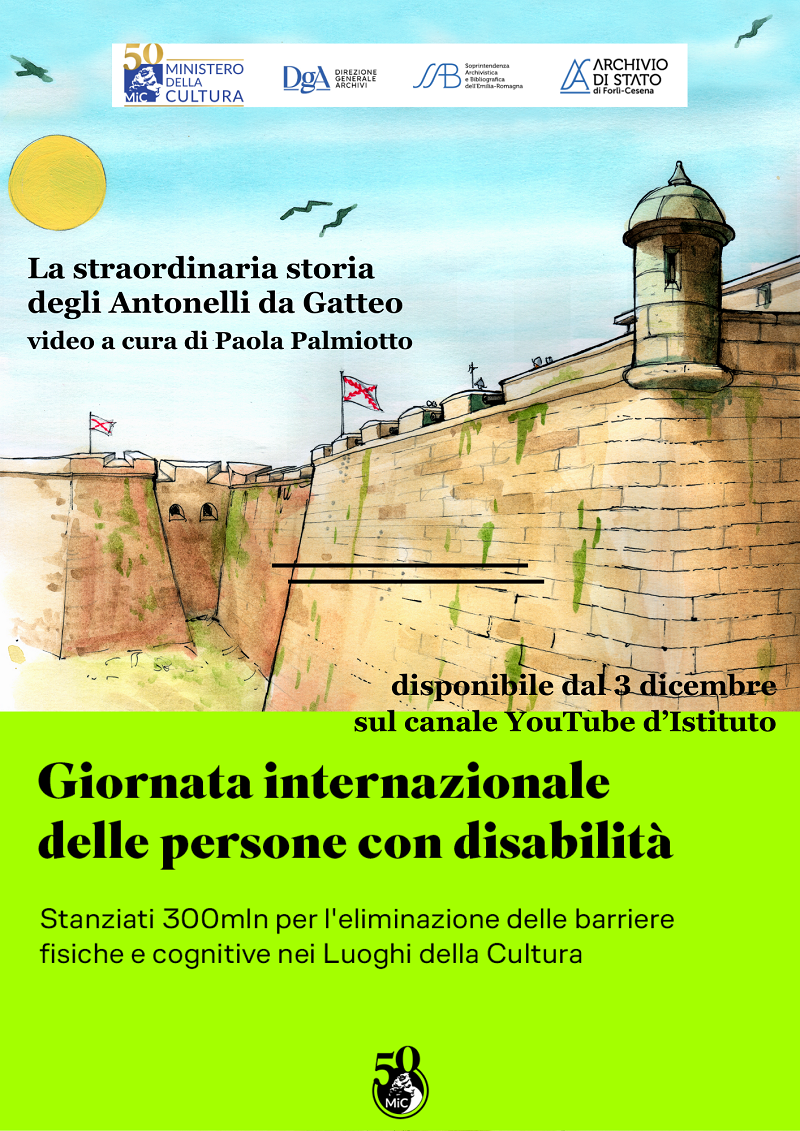 In occasione della Giornata internazionale delle persone con disabilità, sarà pubblicato sul canale YouTube dell'Archivio di Stato di Forlì-Cesena un breve video, audio e sottotitolato, che illustrerà la mostra "La straordinaria storia degli Antonelli da Gatteo. Una famiglia di architetti e ingegneri militari alla corte dei re di Spagna tra XVI e XVII secolo", realizzata a cura dell'Ecoistituto di Cesena - Gruppo di Ricerca sulle Tecnologie Appropriate, grazie alla ricerca storica intrapresa da Daniele Zavalloni, Michele Ceccaroni e Piero Carusone nel 2015 e allestita fino al 22 ottobre scorso presso l'Istituto.